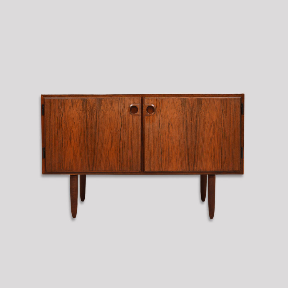 Petite enfilade basse - commode en palissandre de Rio dessinée dans les années 60 par Sven Ellekaer pour l'éditeur danois A. Hansen. Piétement en hêtre massif.